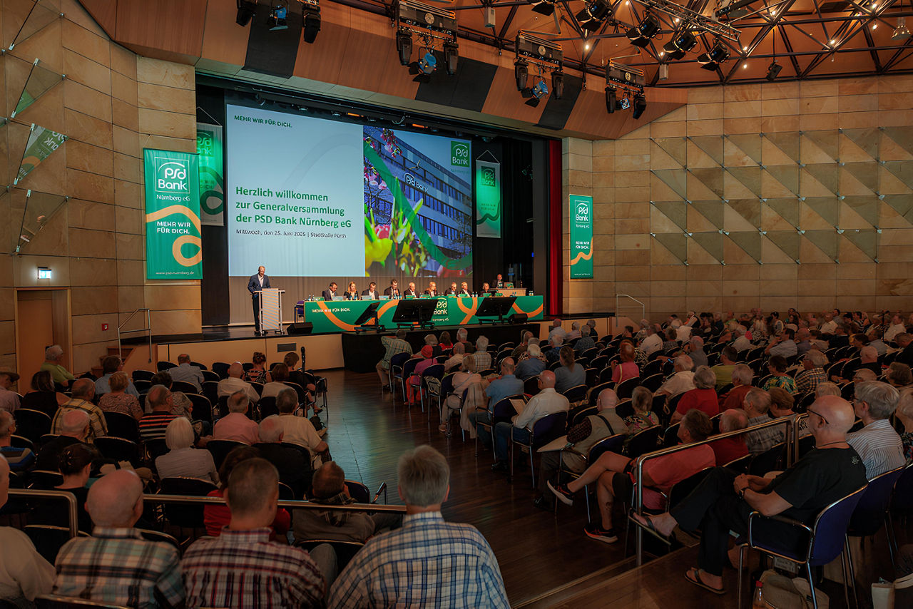 Die Vorstellung des Jahresabschlusses 2024 bildete einen wichtigen Tagesordnungspunkt auf der gestrigen Generalversammlung der Bank. Rund 580 Mitglieder waren der Einladung gefolgt, in der Stadthalle Fürth von ihrem genossenschaftlichen Mitbestimmungsrecht Gebrauch zu machen und ihre Fragen an den Vorstand und den Aufsichtsrat zu richten. Unter anderem beschloss die Versammlung erneut eine Dividende auf Geschäftsanteile in Höhe von 3,50 Prozent.